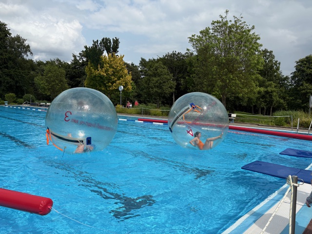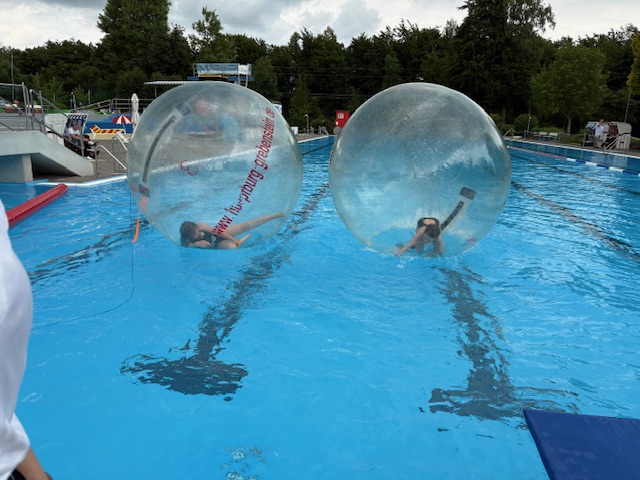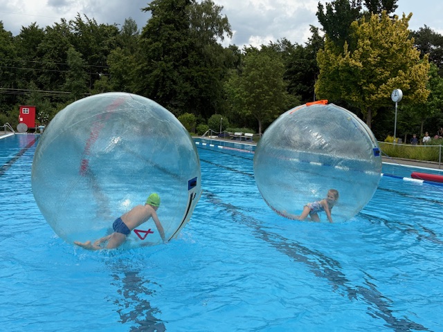Das Highlight waren jedoch die Wasser-Laufbälle. Diese werden mit Luft aufgeblasen und ein Kind geht hinein. Durch Laufen im Ball bewegt sich der Laufball auf dem Wasser. Die Kinder kullerten dabei in den Bällen herum und hatten sehr viel Spaß. Vielen Dank an Julia Löbel und ihren Mann, die die Bälle besorgt hatten und den ganzen Nachmittag betreuten.